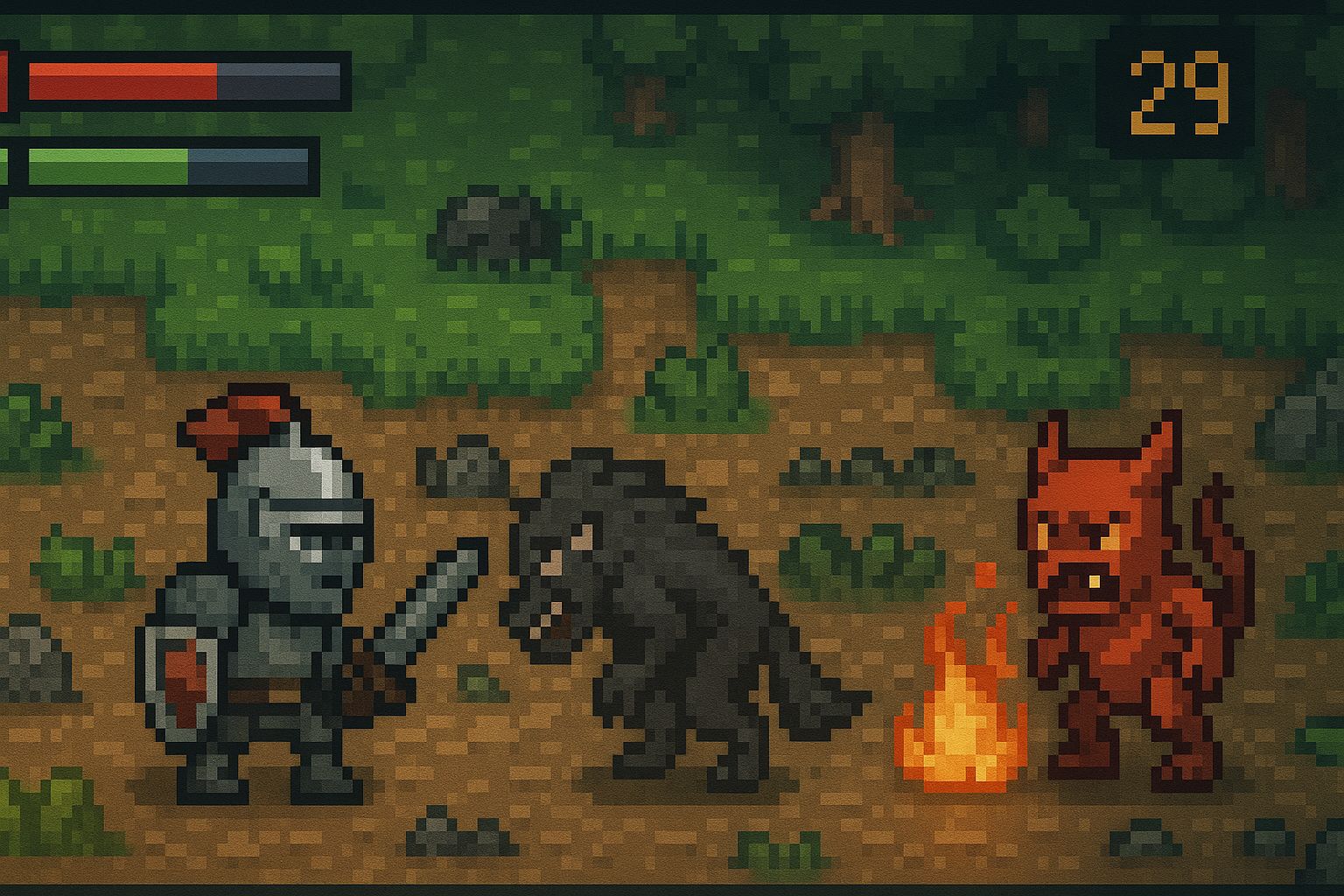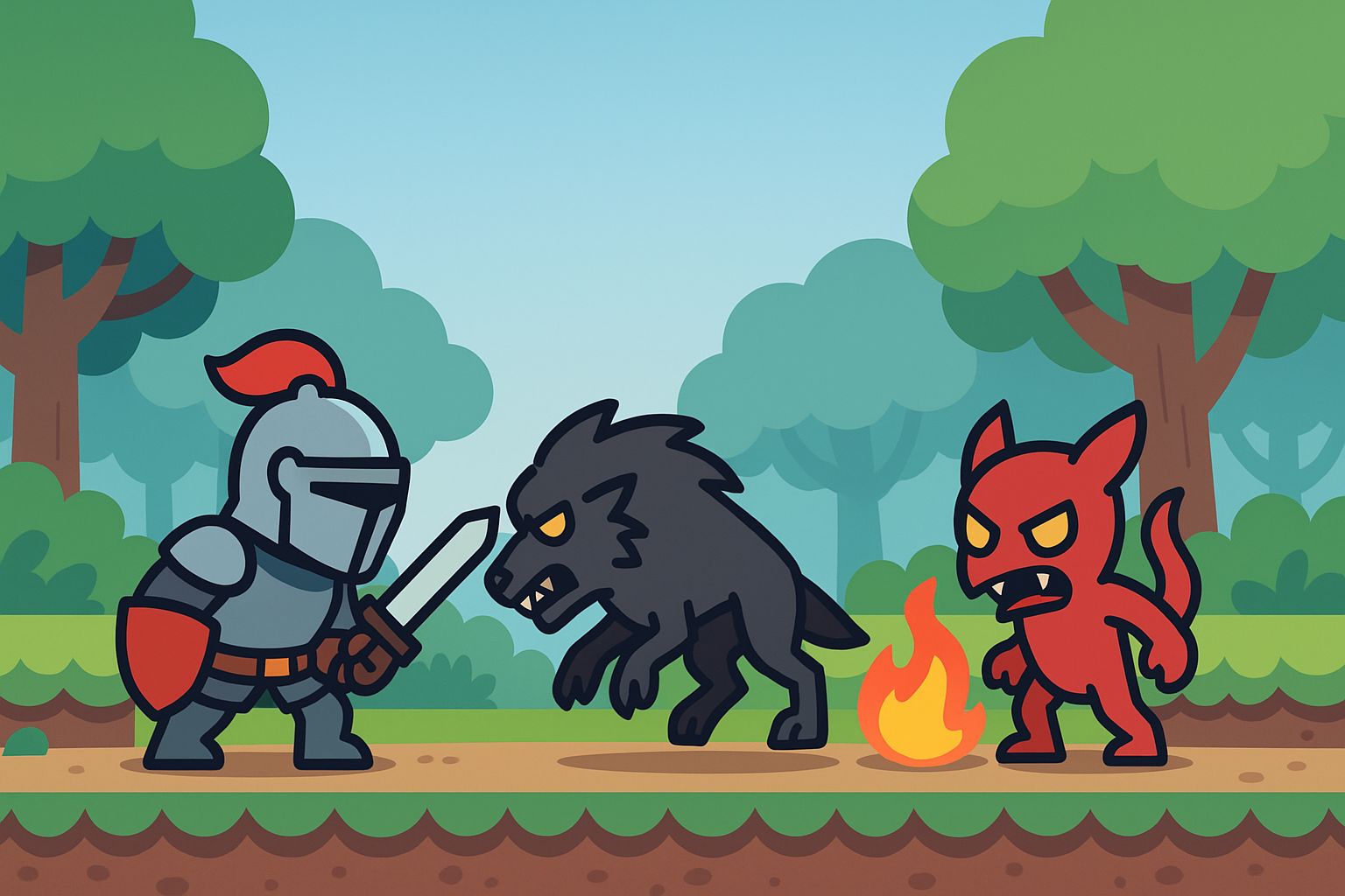 Lekkie wagowo tło, które szybko się ładuje, a postacie i efekty — w rastrze, żeby nie obciążać CPU złożonym renderowaniem wektorowym.