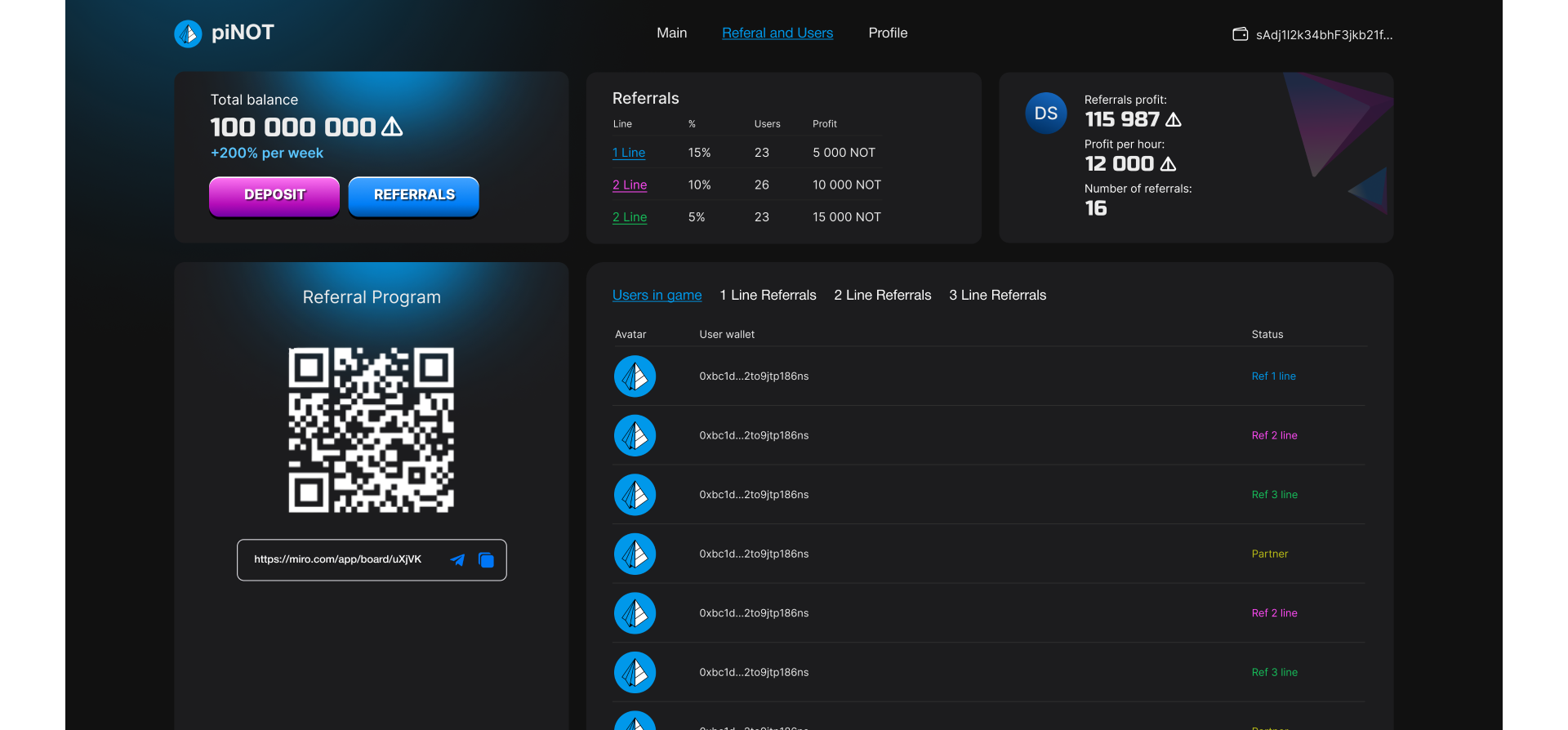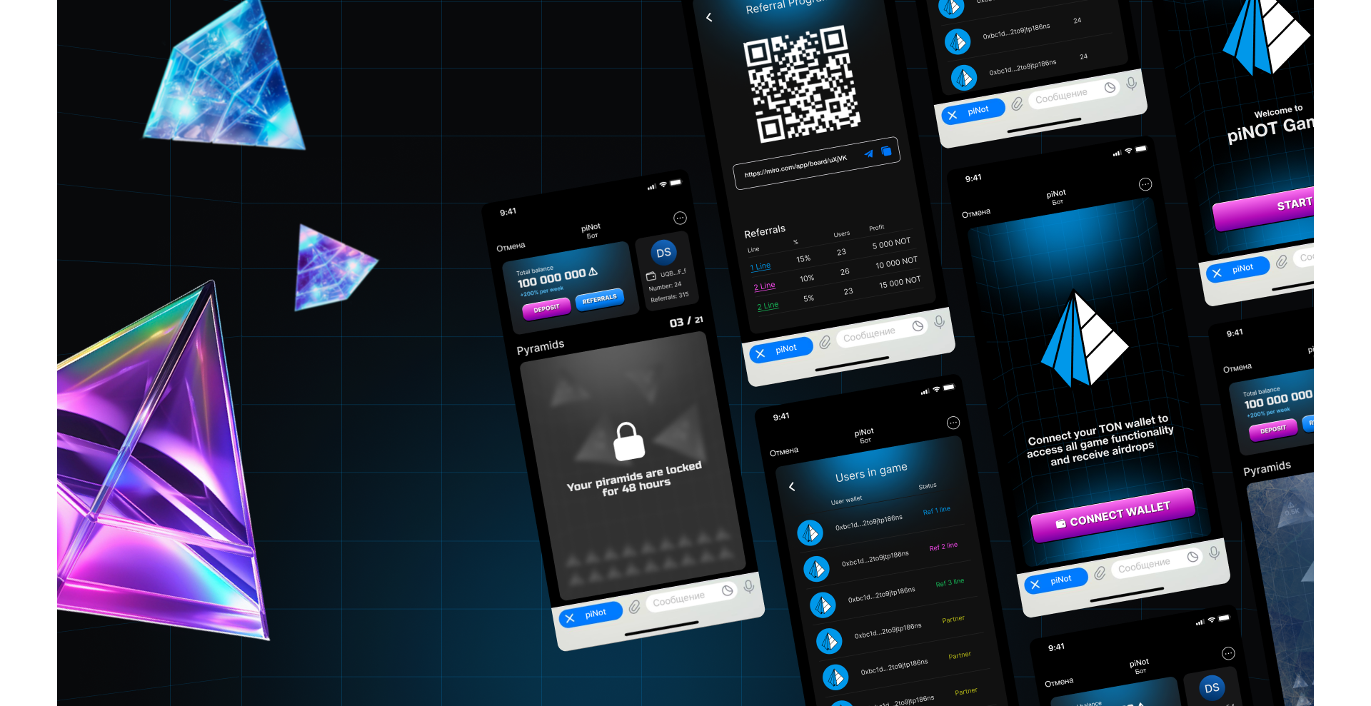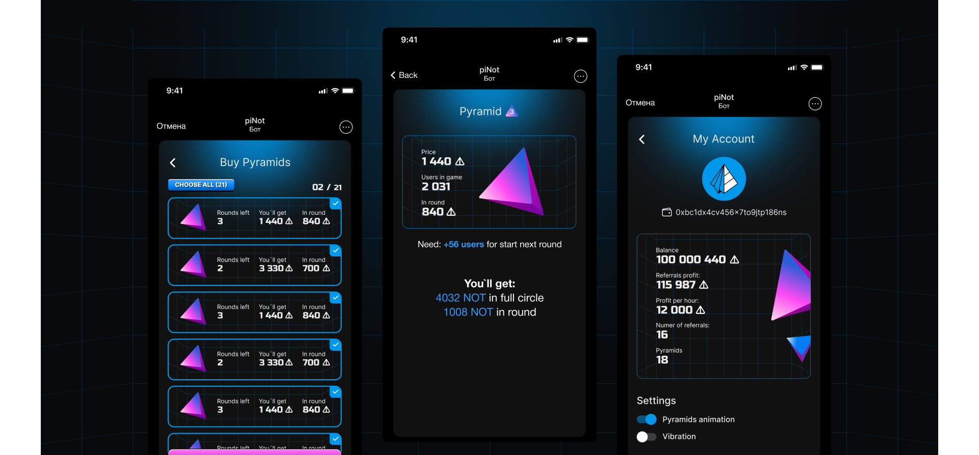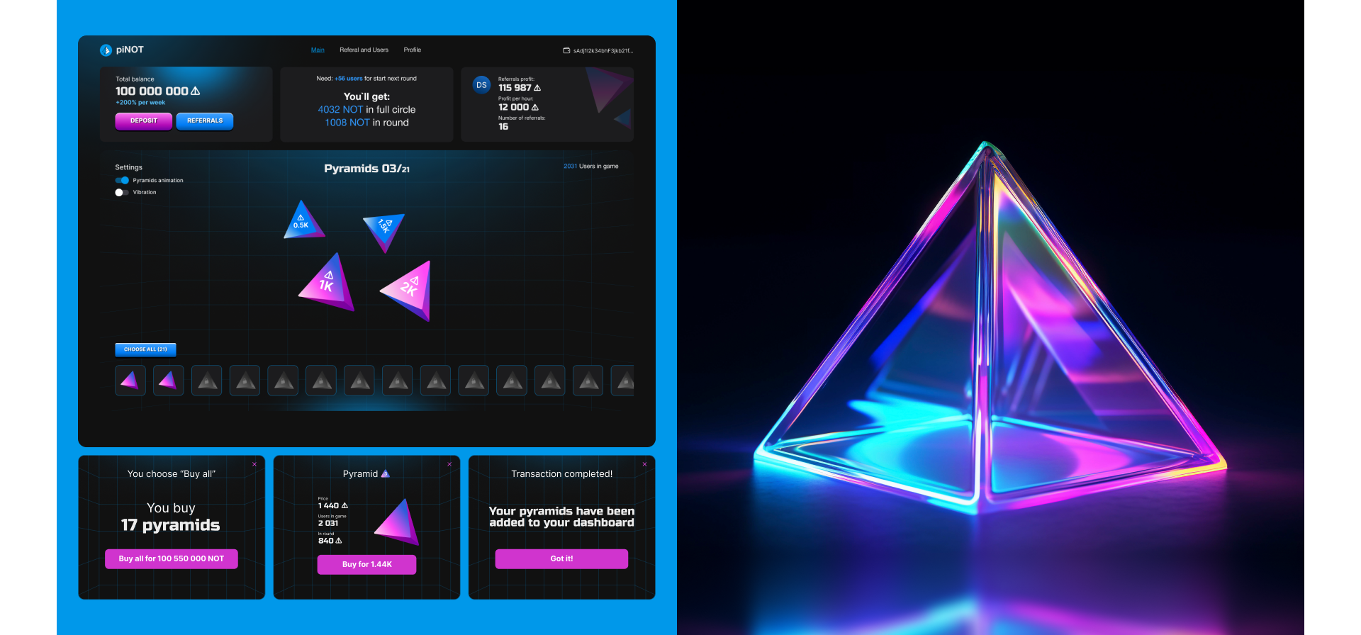 piNot to aplikacja finansowo-gamingowa w formacie Telegram WebApp, zbudowana na zasadzie „matrycowej” gry krypto. Użytkownicy kupują piramidki za tokeny NOTcoin, otrzymują dochód w kilku etapach, biorą udział w programie poleceń i zarządzają swoim polem gry, na którym wyświetlane są obracające się piramidki.