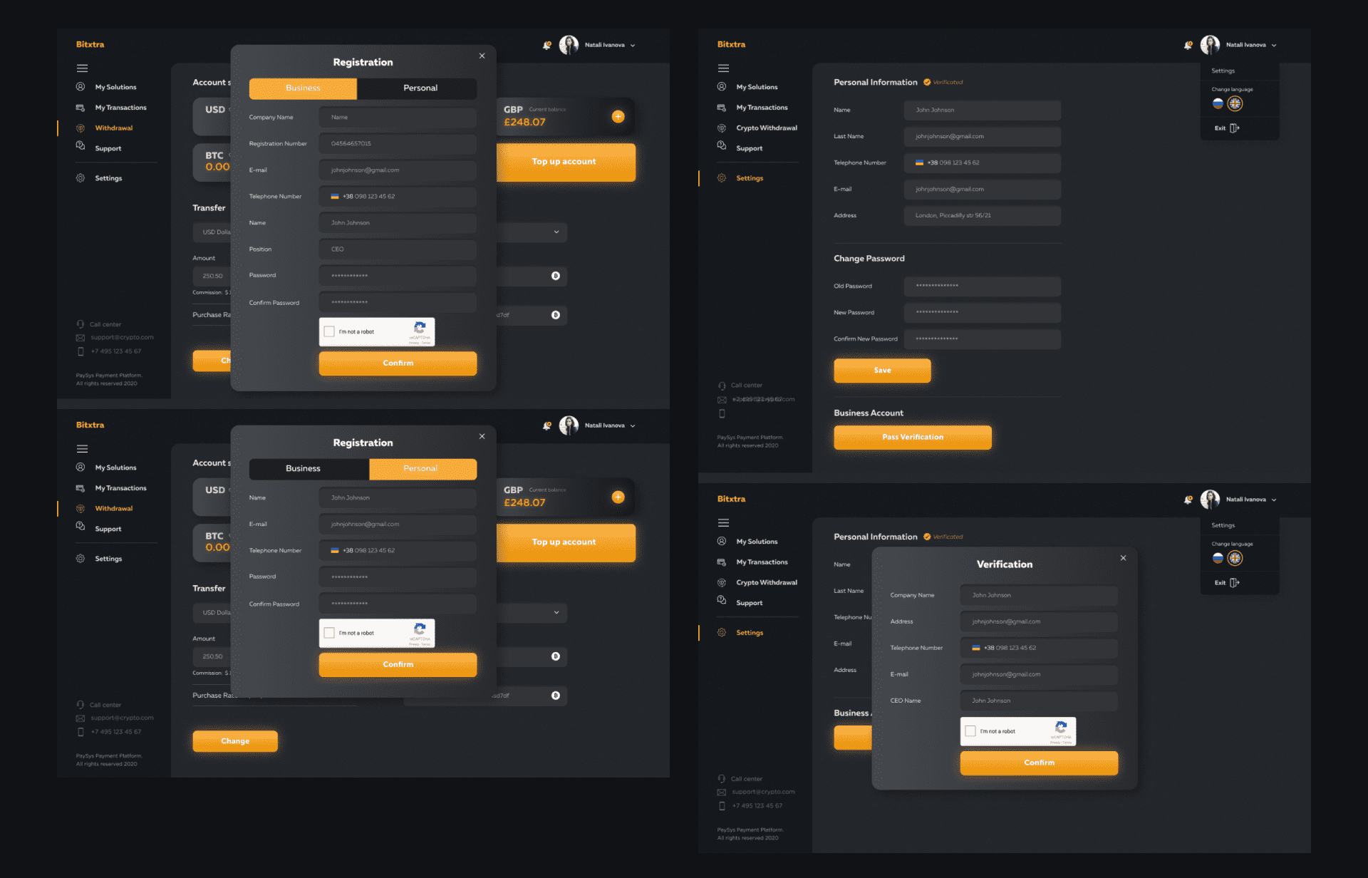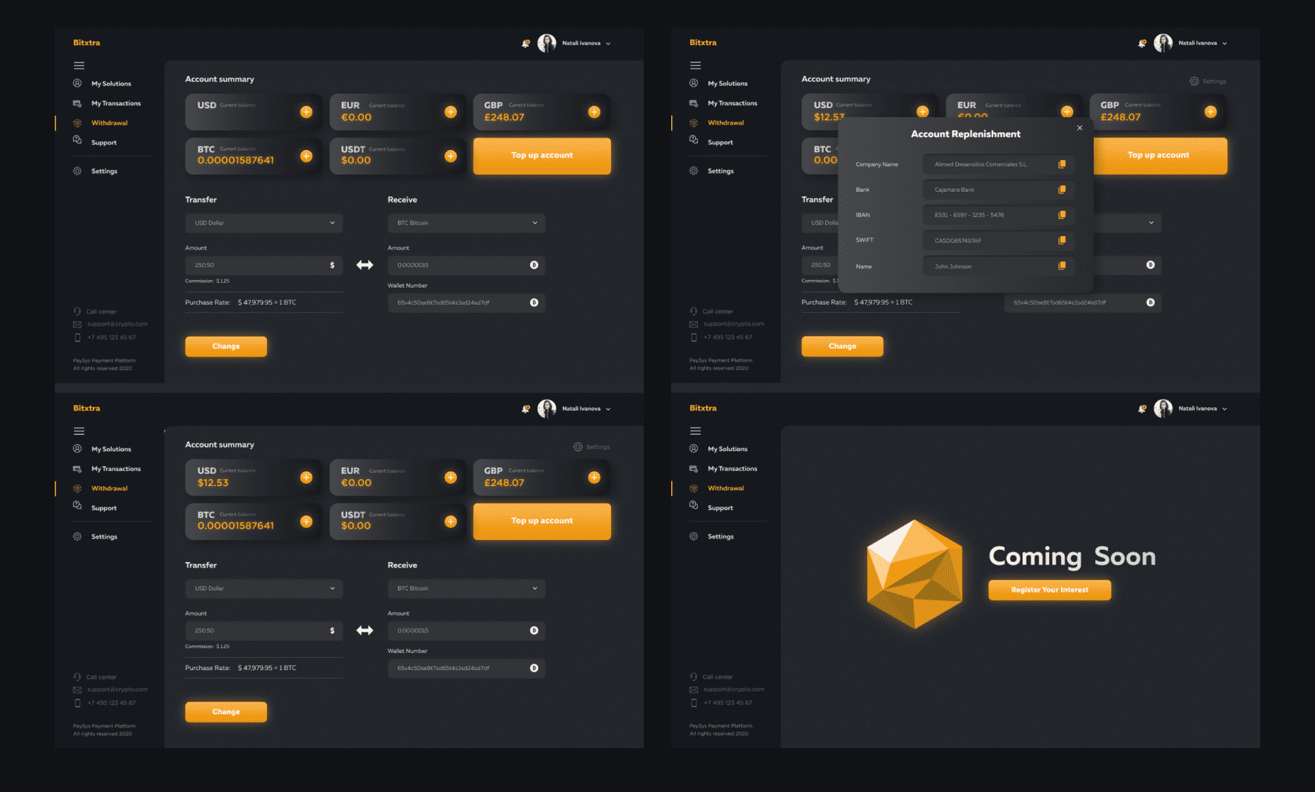 Opracować wygodną i wielofunkcyjną platformę do zarządzania finansami, w której użytkownicy będą mogli łatwo zarządzać swoimi danymi osobowymi, a także śledzić stan swoich kont w różnych walutach, w tym zarówno fiat, jak i kryptowalutach. System umożliwia otrzymywanie środków pieniężnych na swoje konta bezpośrednio z banków na całym świecie za pośrednictwem SEPA i SWIFT, a także realizowanie wypłat środków na karty VISA i Mastercard.
