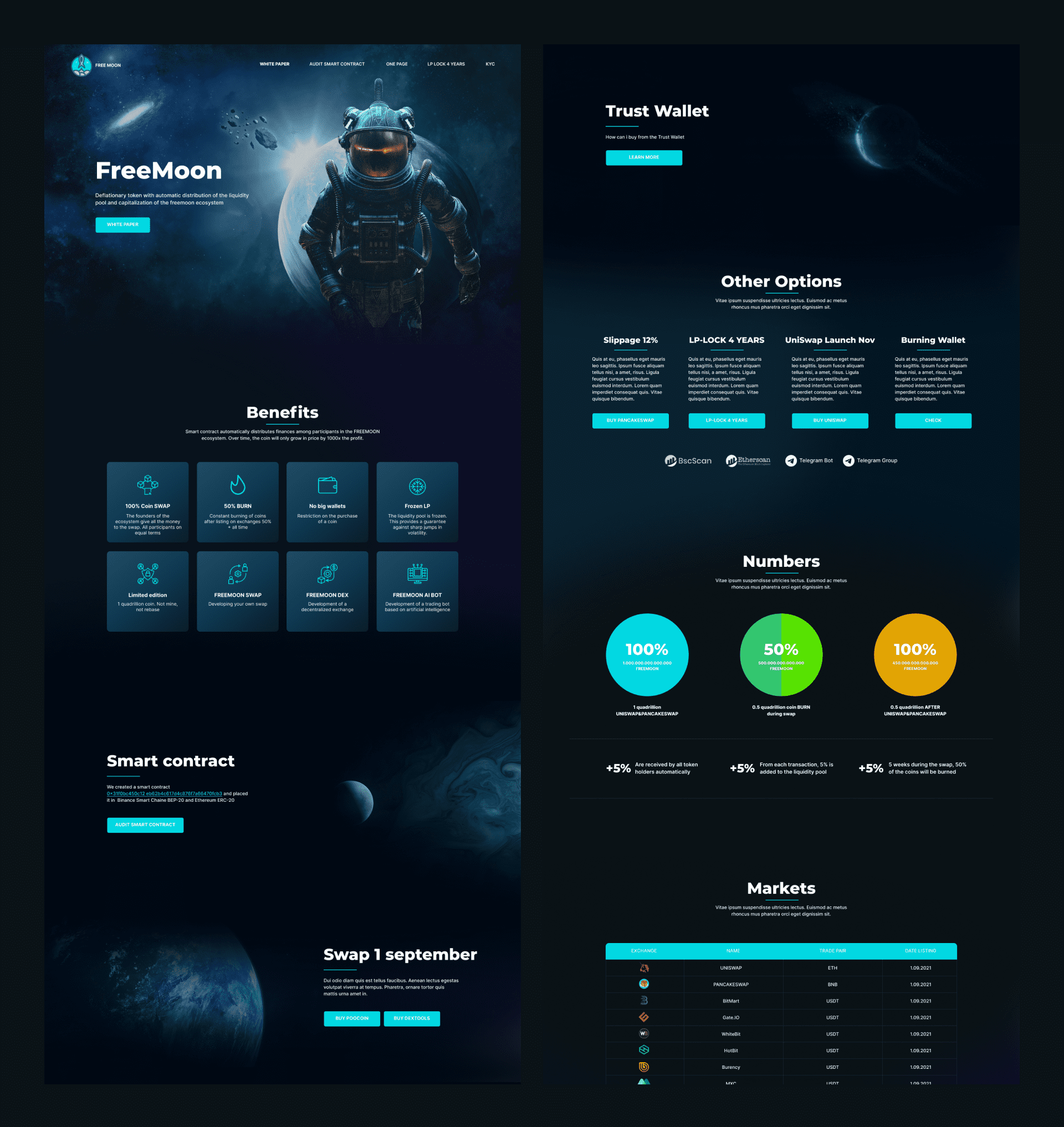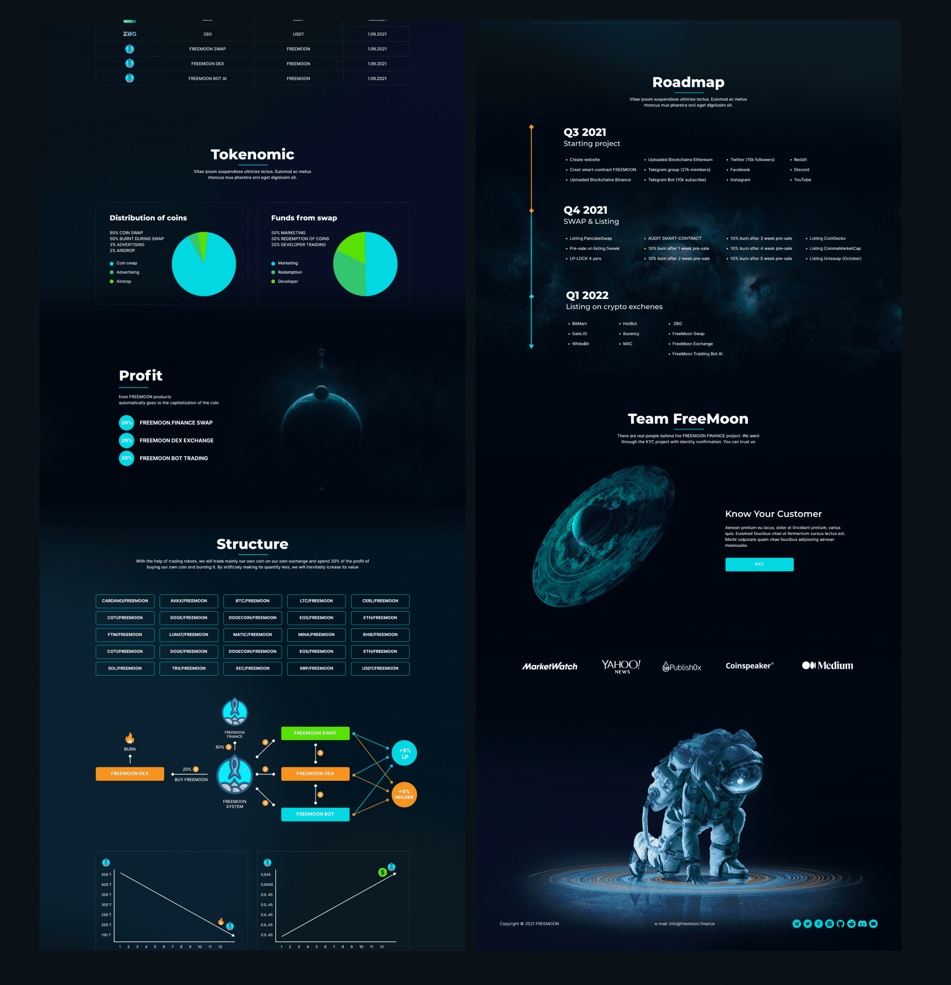 Opracować atrakcyjny i intuicyjny projekt landing page tokena FREEMOON, który przyciągałby nowych inwestorów oraz posiadaczy tokena. Prace Front-End były ukierunkowane na stworzenie wygodnego interfejsu dla użytkowników, który umożliwiałby łatwe wykonywanie operacji na tokenie, w tym migrację na nową wersję tokena.