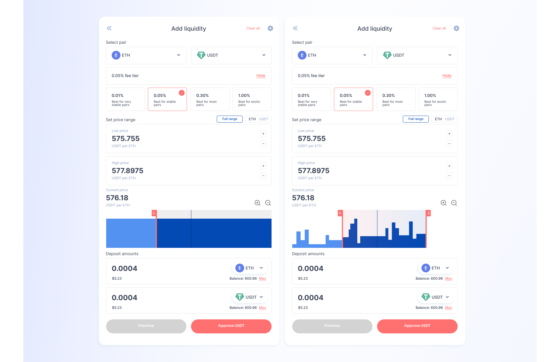 - Add/Remove Liquidity (v3): wybór pary, fee tier, wizualny zakres cen, depozyty według tokenów, podgląd pozycji.