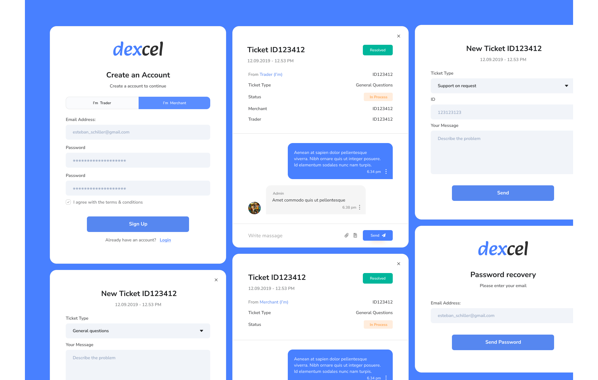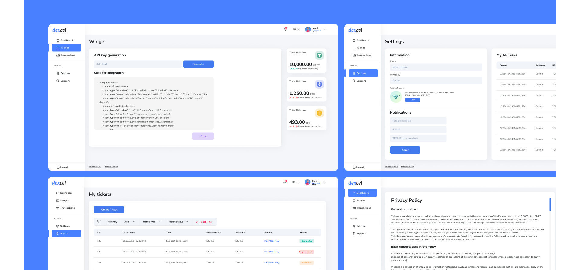- Makiety UI/UX: dashboard, widget/klucze API, ustawienia i powiadomienia, historia transakcji, tickety, polityki/strony prawne — przygotowane ekrany i koncepcje wizualne (zob. screeny).