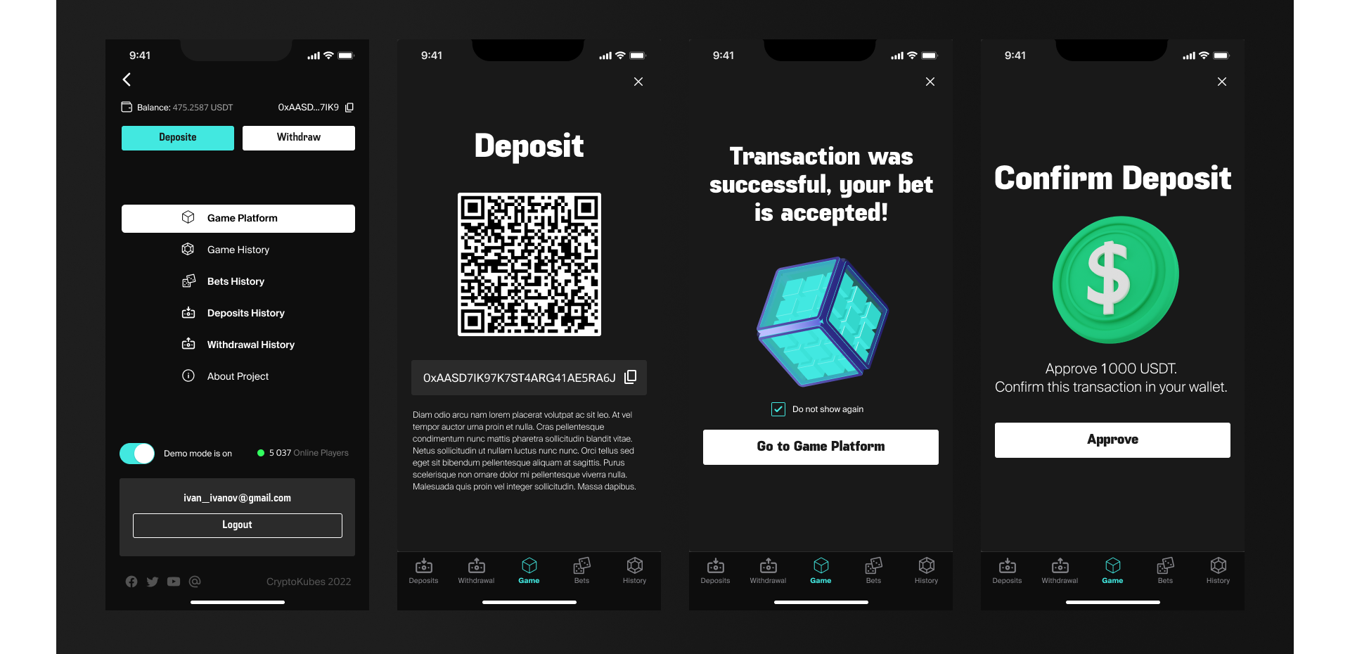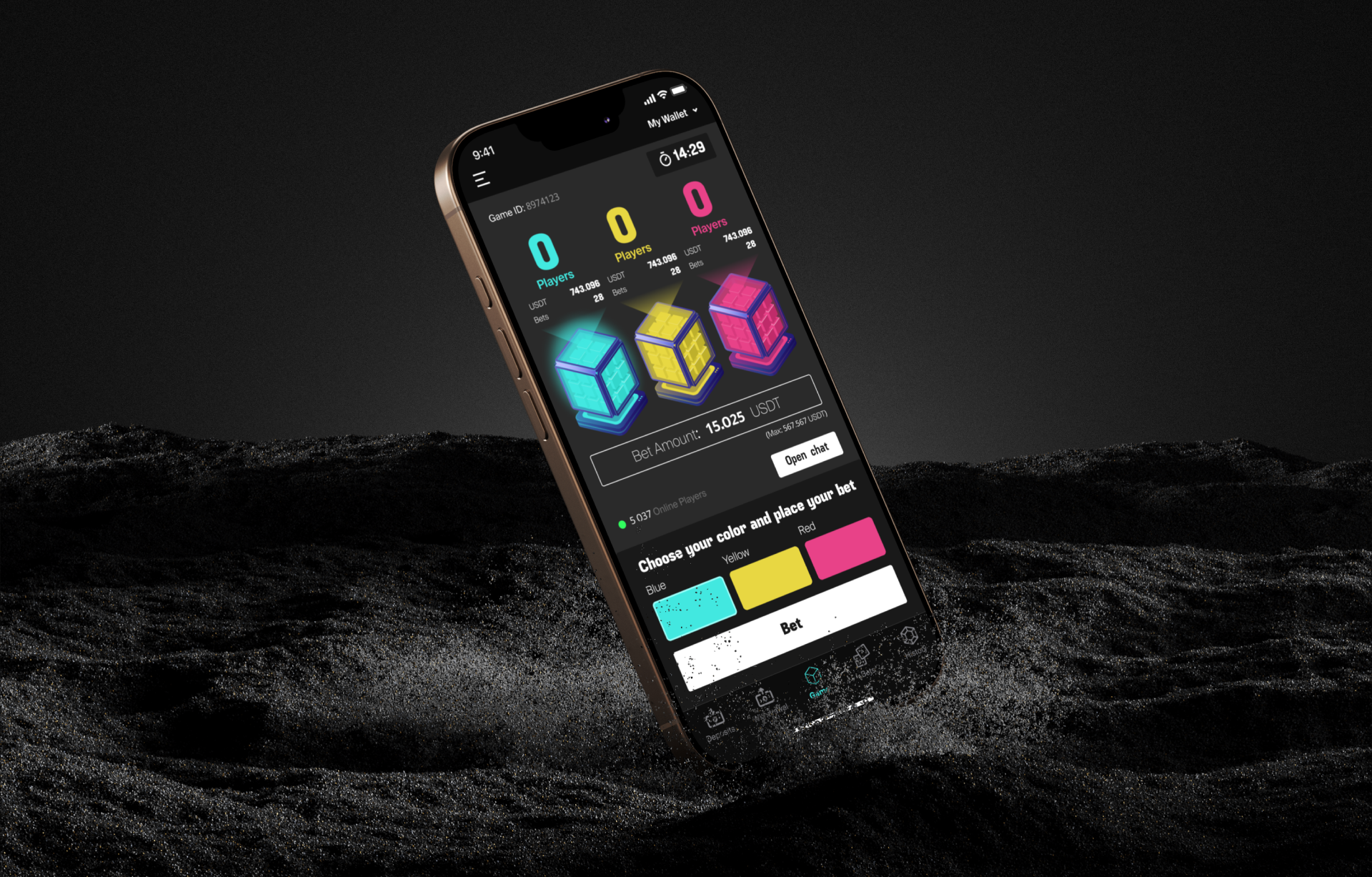 Gra blockchain z mechaniką zakładów, w której użytkownicy obstawiają w USDT kolory kostek, oparta na smart kontraktach sieci Tron. Aplikacja została zrealizowana jako rozwiązanie wieloplatformowe na iOS i Android z obsługą portfela kryptowalutowego oraz interfejsu gry.