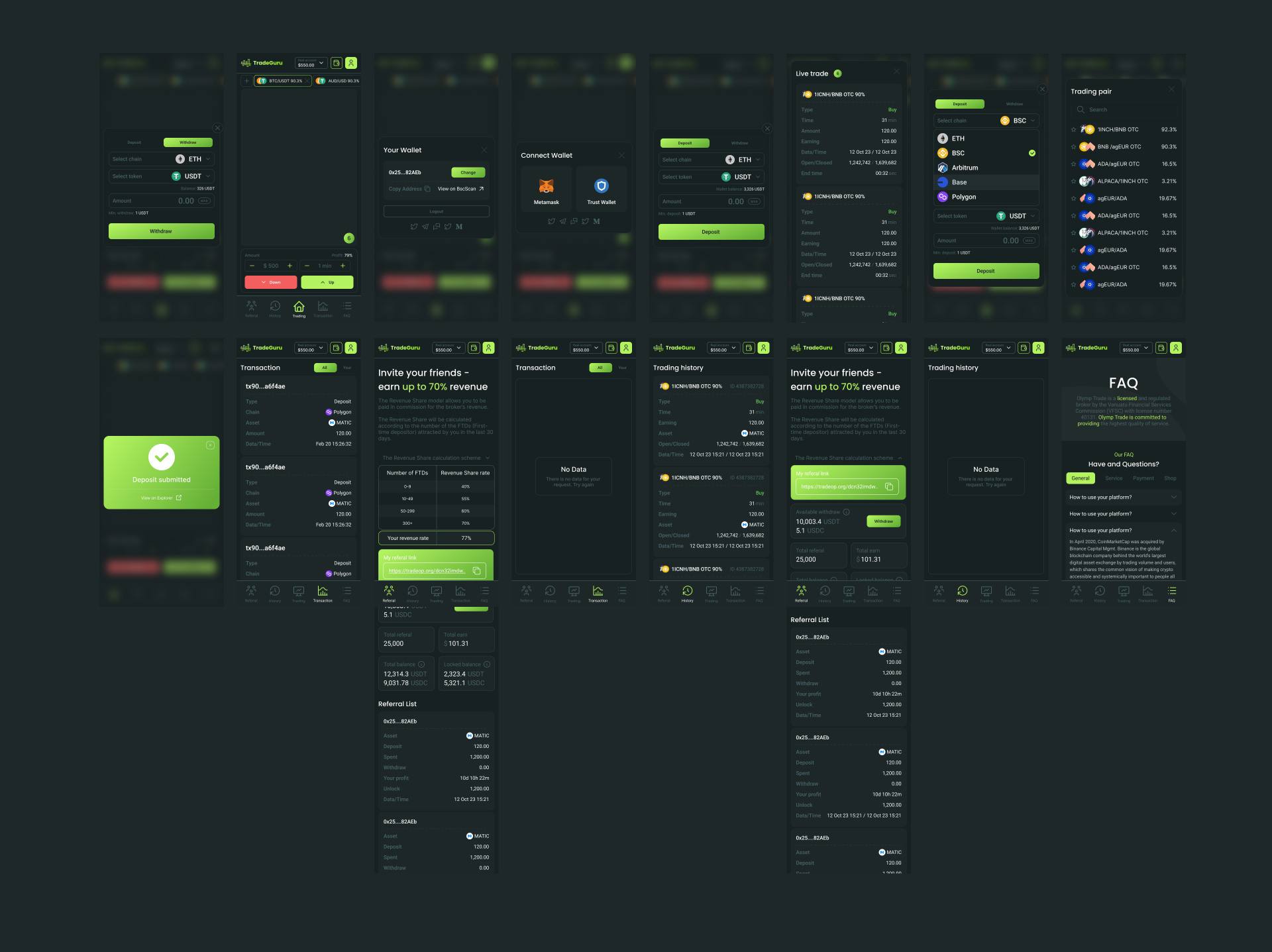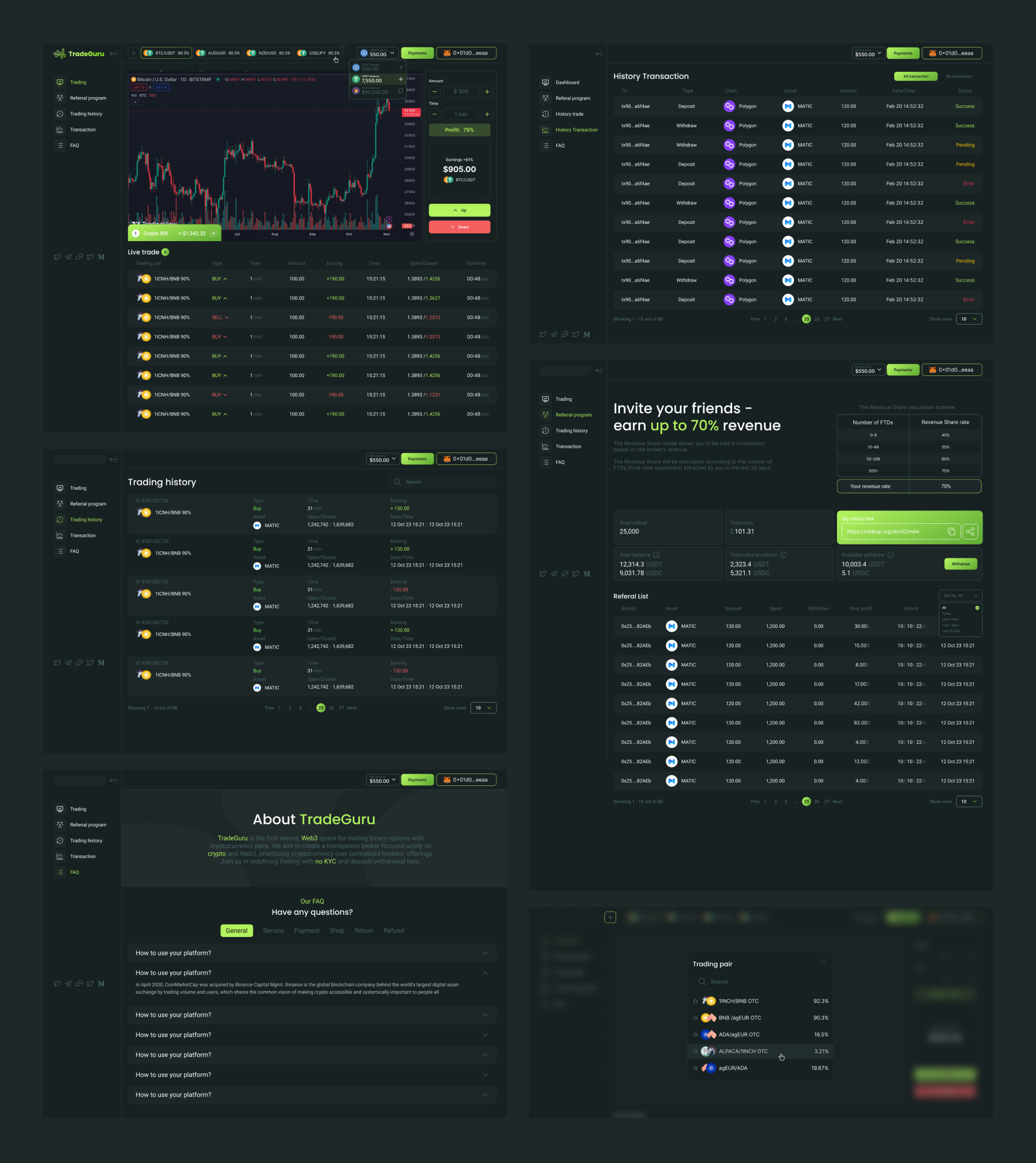 Modułowy terminal React/TypeScript: tryb Live trade, filtry i sortowanie, zakładki Trading, Trading history, History transaction, Referral, FAQ. Przepływy depozytu/wypłaty USDT z wyborem sieci i statusami Pending/Success/Failed, portfel i PnL, powiadomienia, responsywna wersja mobilna.