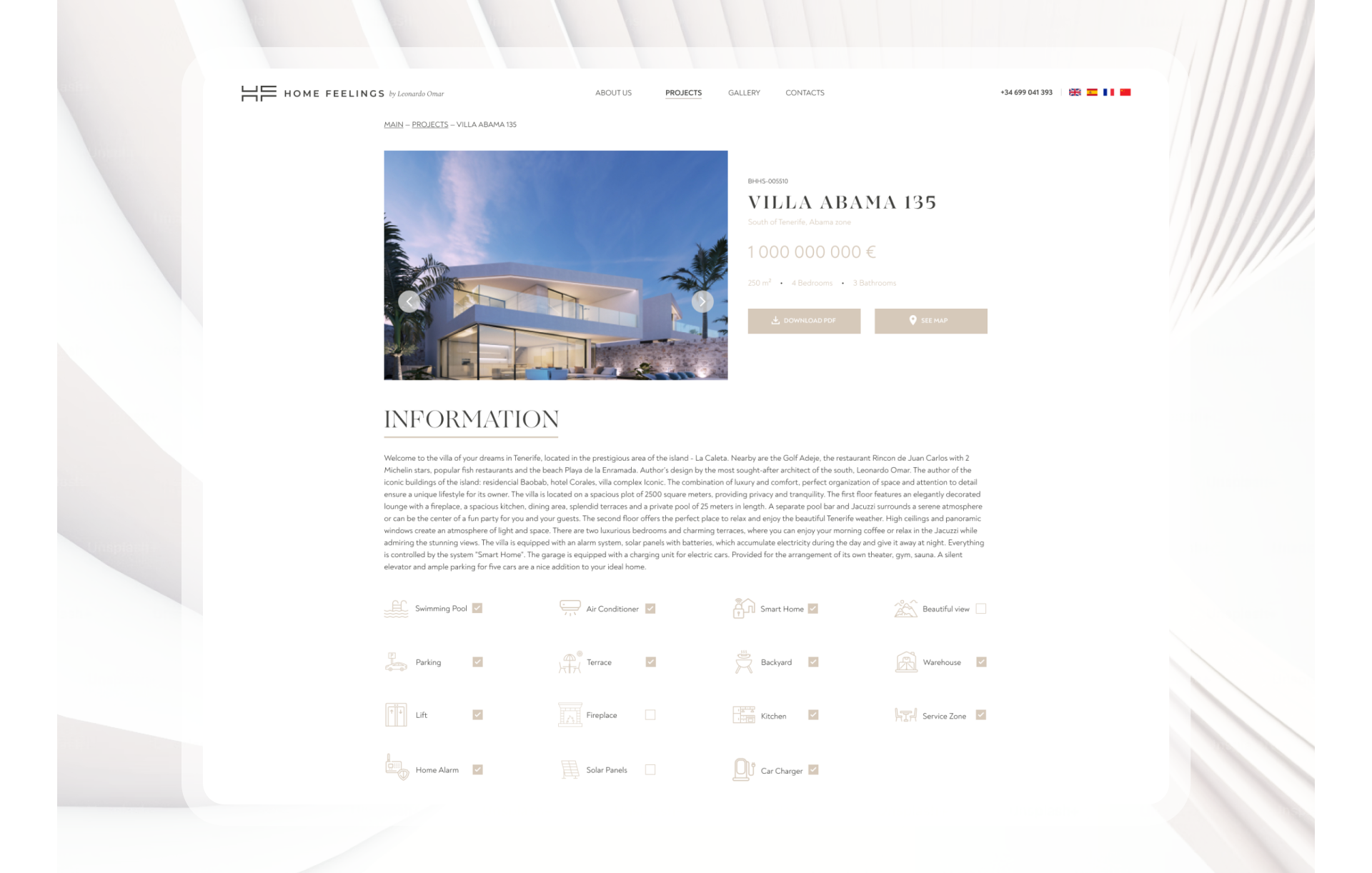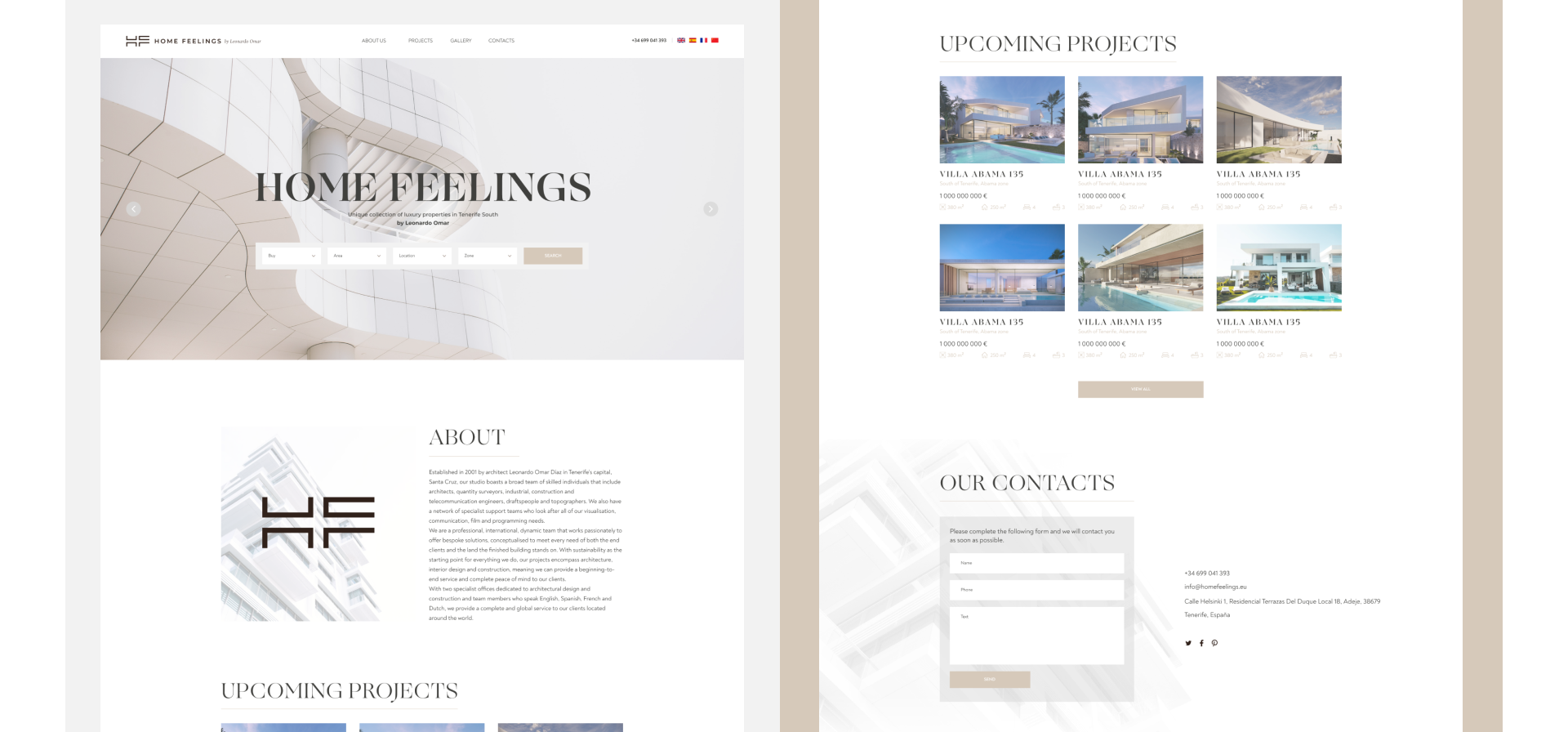 Butikowa platforma nieruchomości premium HOME FEELINGS: kolekcja willi na południu Teneryfy autorstwa architekta Leonardo Omara, katalog projektów, karty z ceną/parametrami, formularz leadowy, wielojęzyczność.