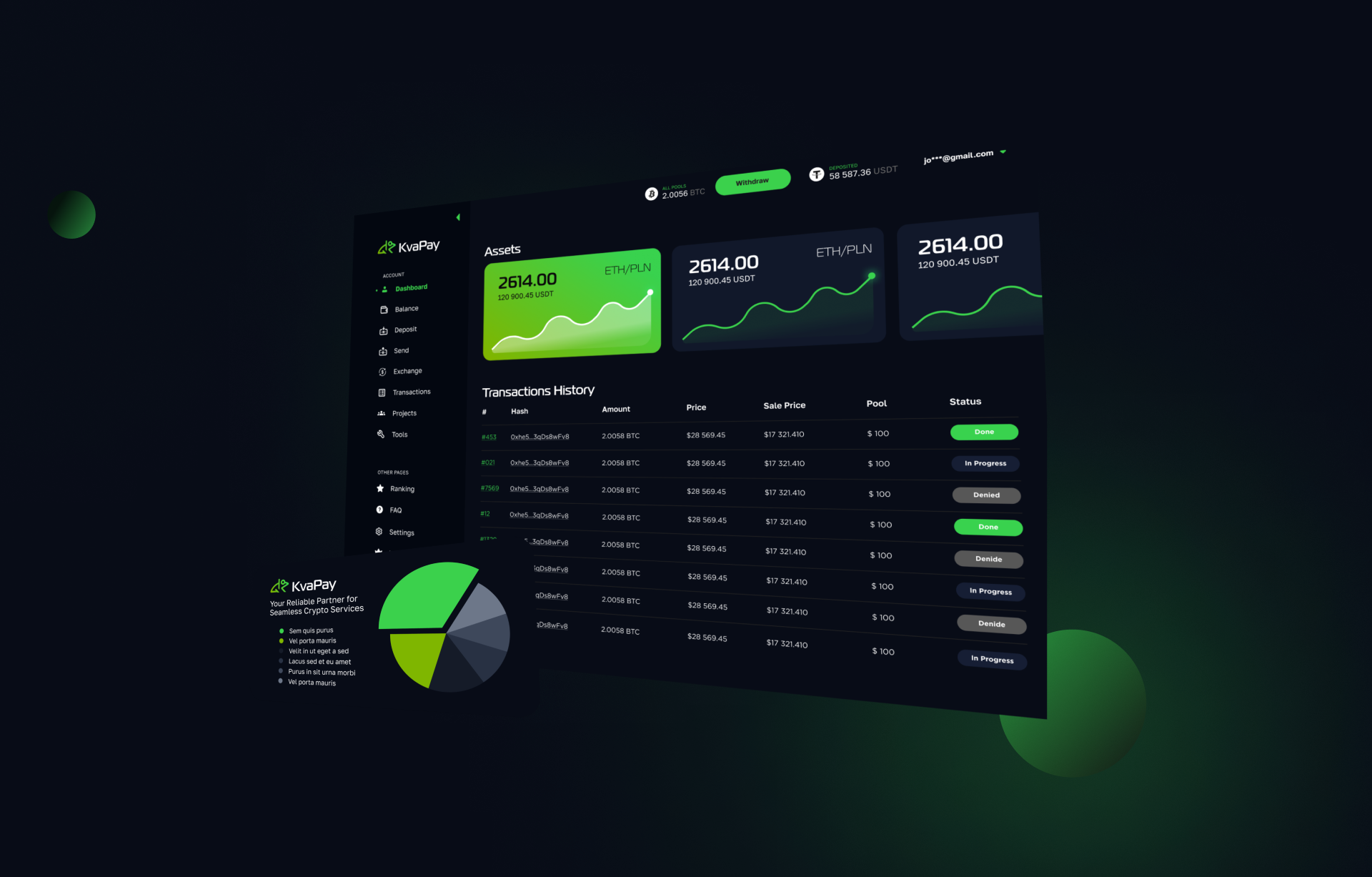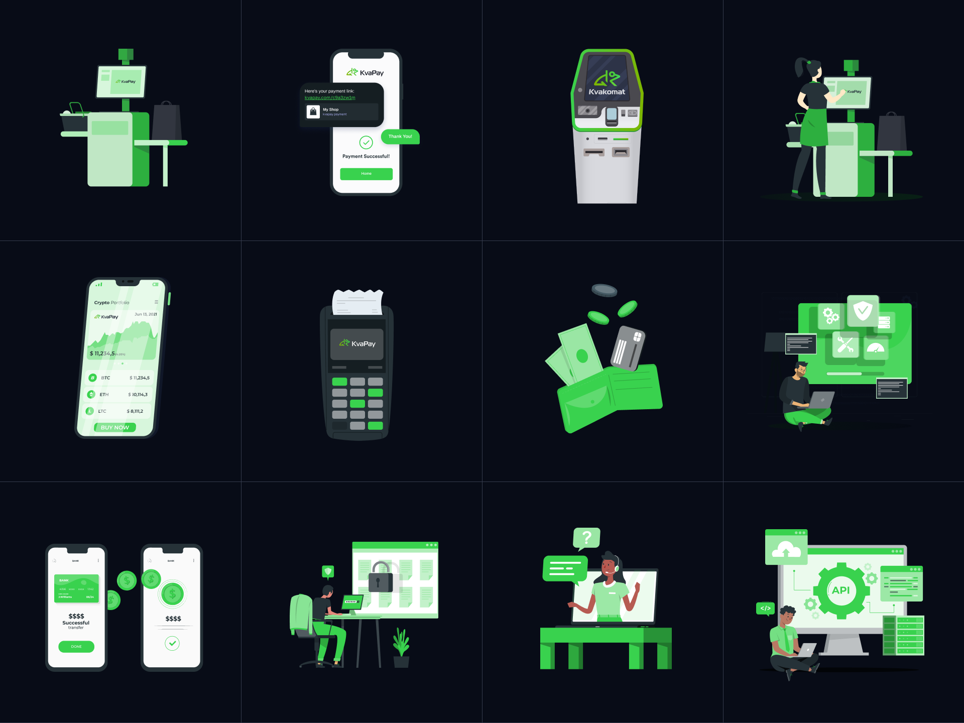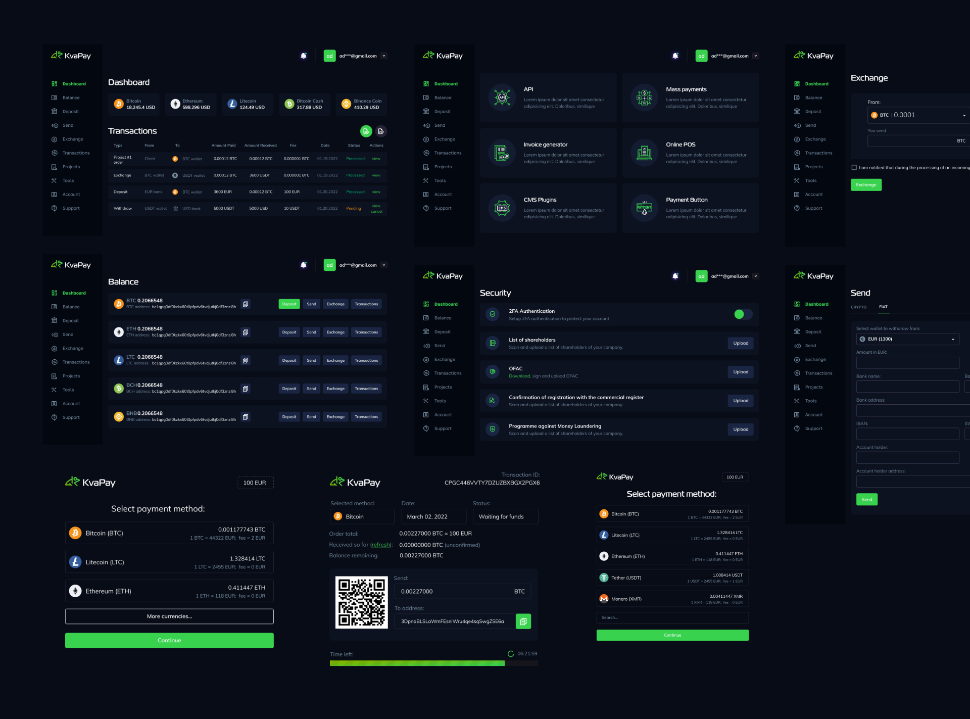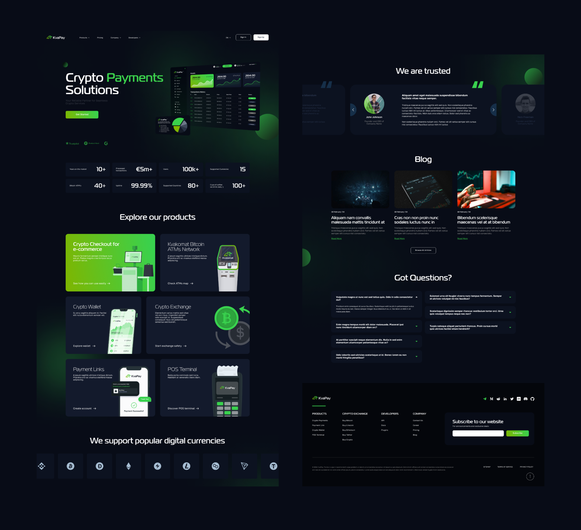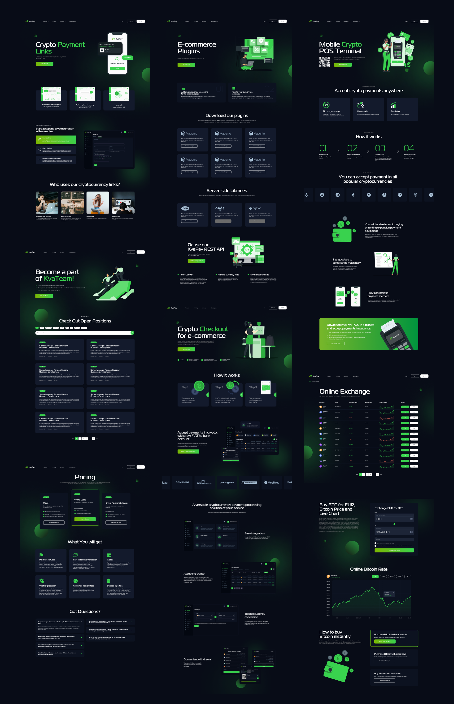 Uruchomić Kvapay jako pełnoprawny crypto processing: landing z USP i metrykami, katalog produktów (Checkout, ATM, Wallet, Exchange, Payment Links, POS), strony produktowe „How it works”, wtyczki i REST API, panel użytkownika z saldami, faktury i wypłaty masowe, bezpieczeństwo 2FA i tickety wsparcia.